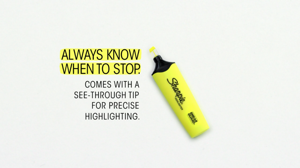 Sharpie Clearview is a new highlighter with a transparent tip that allows people to stop highlighting more precisely than before. Our idea was to take this insight of “Always know when to stop” show how it works with a simple demonstration but also extend the thought into everyday life situations.
